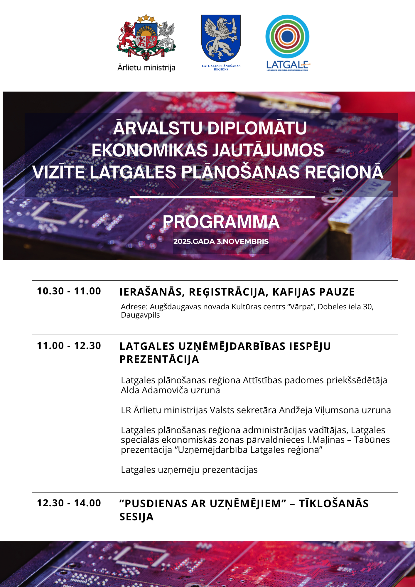 Aicinām Jūs 2025.gada 3.novembrī apmeklēt Latgales uzņēmējdarbības iespēju prezentāciju un “Pusdienas ar uzņēmējiem” – tīklošanās sesiju, kas tiek organizēta ārvalstu diplomātu ekonomikas jautājumos vizītes ietvaros un notiks Kultūras centrā “Vārpa”, Dobeles ielā 30, Daugavpilī.